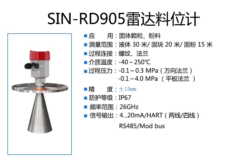 當前位置:首頁 > 雷達液位計 > SIN-RD905雷達料位計_適用于固體顆粒、粉料_
